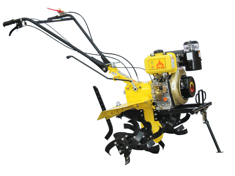在微型机行走机构的六方轴上,分左右装上旋耕道具组件,再用两颗Φ8x50销轴和B销轴向定位即可进行旋耕作业。