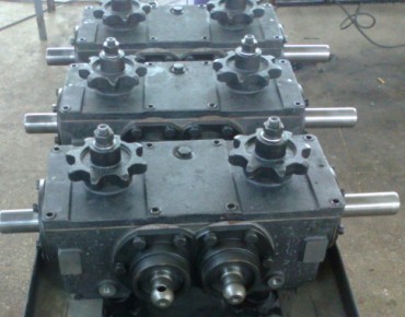 ,设有箱壳,设有动力输入轴,动力输入轴动伞齿轮伞齿轮动伞轮啮合;两个主动伞轮啮合;后壁上也设有2个后动力输出轴,其箱壳内的一端,也分别设有一个被动伞齿轮,本实用新型适用于与玉米收割机配套使用,