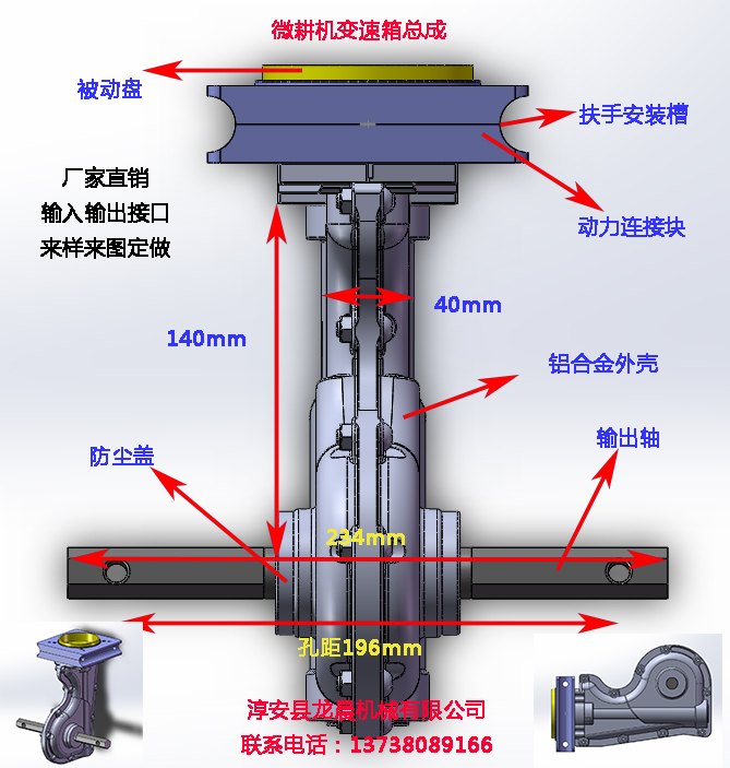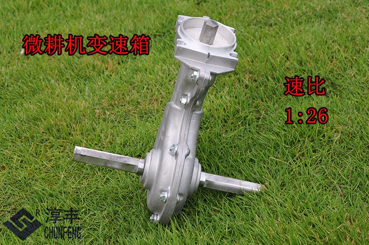变速箱是松土机、微耕机的关键配件之一。该主件外壳为铝合金,箱体内有一组齿轮、蜗杆组成变速装置,本厂研发的松土机变速箱与国内同等产品相比具有性能好、噪音小、重量轻、寿命长、外观漂亮等优点。