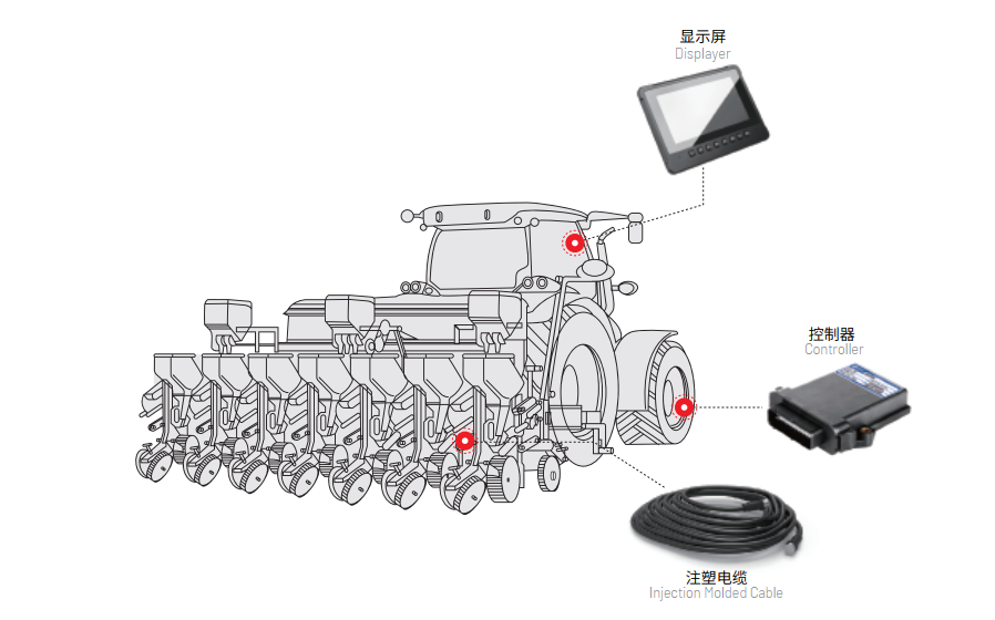 精量播种机电控系统以硕博电子7寸显示屏SPD-070-Ax、SPC-SFMC-X2214A控制器为核心,通过CAN总线进行通信,辅以注塑电缆作为拖拉机与播种机之间的电气连接。