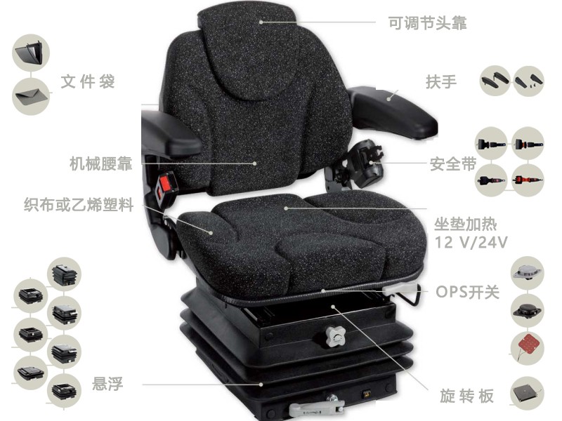 适用于农业机械,工程机械,外部金属框架,符合人体工学舒适坐垫,靠背调节角度-73° +17,5°,前后调节150 mm。