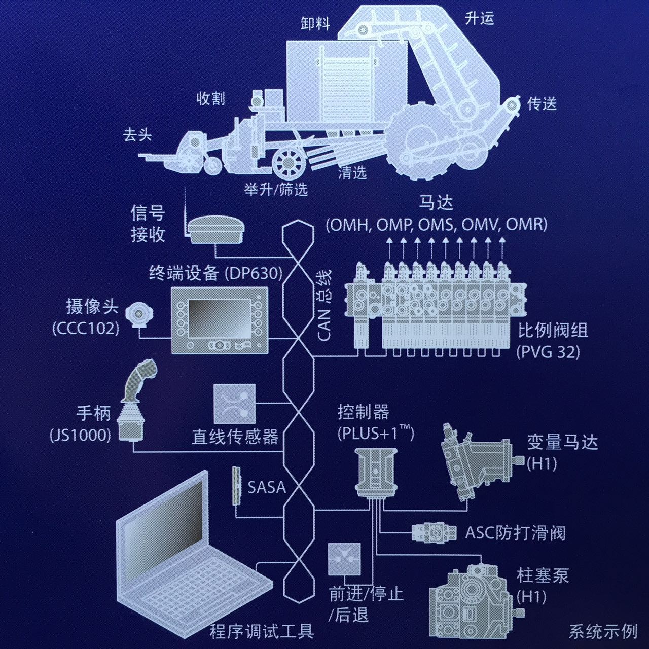 电控手柄或电控脚踏板通过CANBUS总线通信,由丹佛斯电控系统控制器实现对行走系统、转向系统及工作系统的控制。