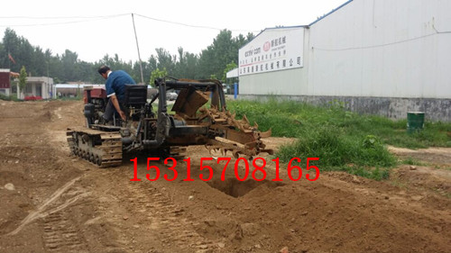 开沟机的主要部件:拖拉机、悬挂架、油缸、变速箱、排土搅龙、链条张紧结构、刮土平整结构、链条刀、链条