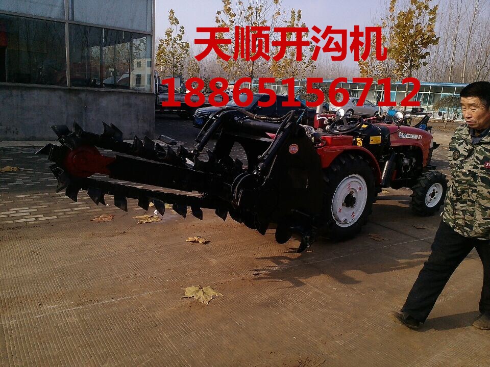开沟机的主要部件:拖拉机、悬挂架、油缸、变速箱、排土搅龙、链条张紧结构、刮土平整结构、链条刀、链条