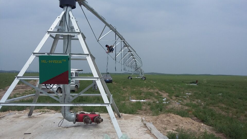 指针式喷灌机是将喷灌机的转动支轴固定在灌溉面积的中心,固定在钢筋混凝土支座上,通过桁架上的喷洒系统向作物喷水的一种节水增产灌溉机械。