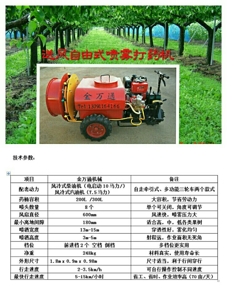 金万通机械有限公司生产多功能喷雾打药机主要用于园林、果园等植被病虫防害的喷雾设备,打药是果园经营和管理的重要环节,以保证果园稳产、高产的重要工具 操作简单:自动行走,轻轻松松喷药。