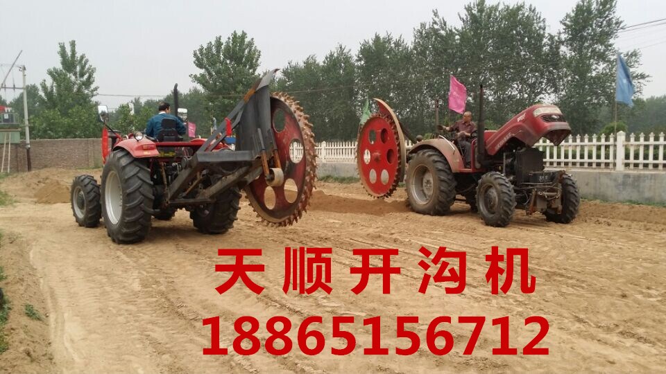 开沟机的主要部件:拖拉机、悬挂架、油缸、变速箱、排土搅龙、链条张紧结构、刮土平整结构、链条刀、链条