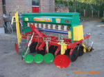 该机一次作业可完成平地丶开沟丶播种丶施肥丶镇压丶覆土丶打竖埨等多项作业。本场新研制的小麦双线播种机,可以同时2次播种丶2次镇压,减少播种次数大大增加了出苗率