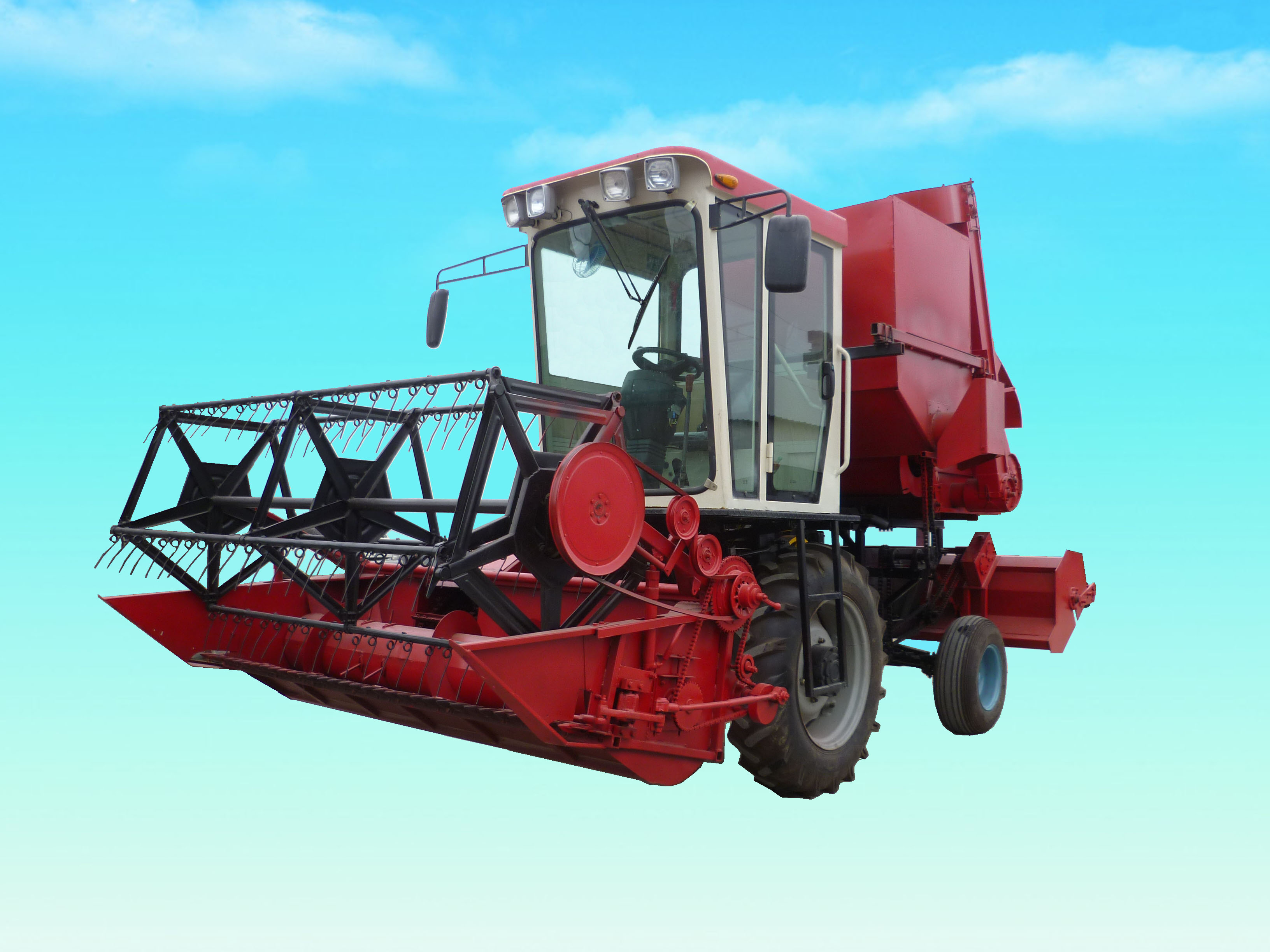 自主研发的稻麦联合收割机,是由独立的割台、输送槽、脱粒机、粮仓和秸秆还田机组成。按装在农用动力底盘上,可一次完成收割、脱粒、清选、装仓、秸秆粉碎还田。