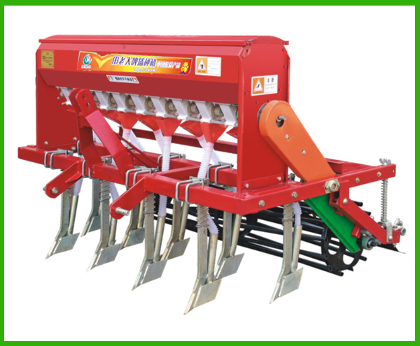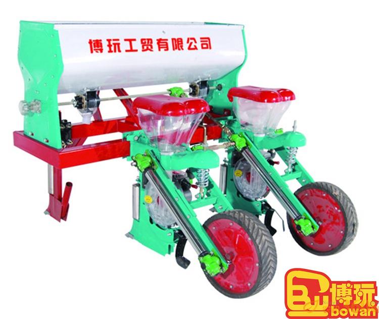 该机与小四轮拖拉机配套使用,采用后置双轴三点悬挂,得用液压升降,排种装置由地轮驱动,使用方便。