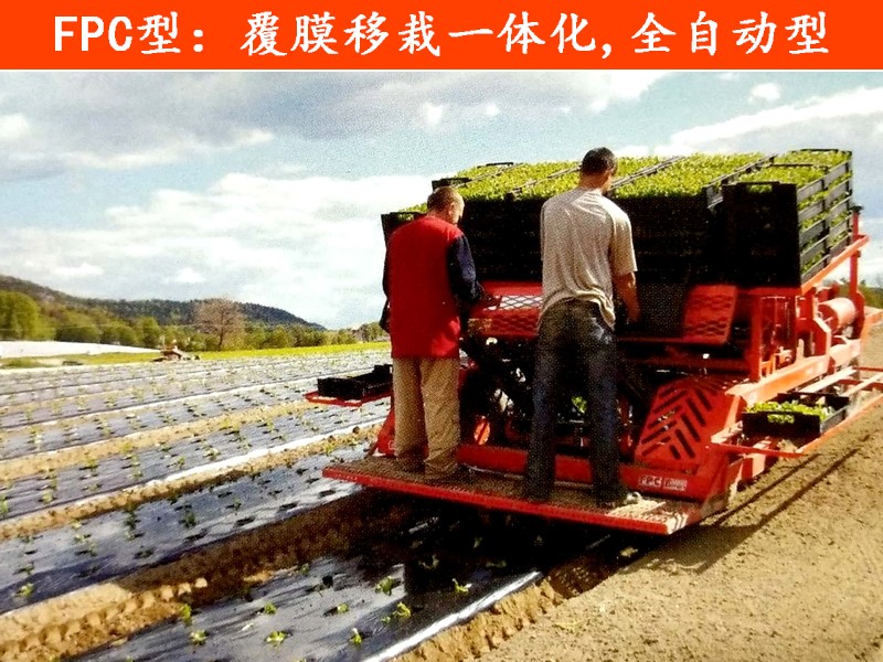 覆膜移栽一体化,全自动型,成排喂苗,每列10株,最高移栽速度:5000株/行/小时;行距:28~112厘米;最小株距:25厘米,连续可调;最大作业行数:6;拖拉机功率范围(马力):80。