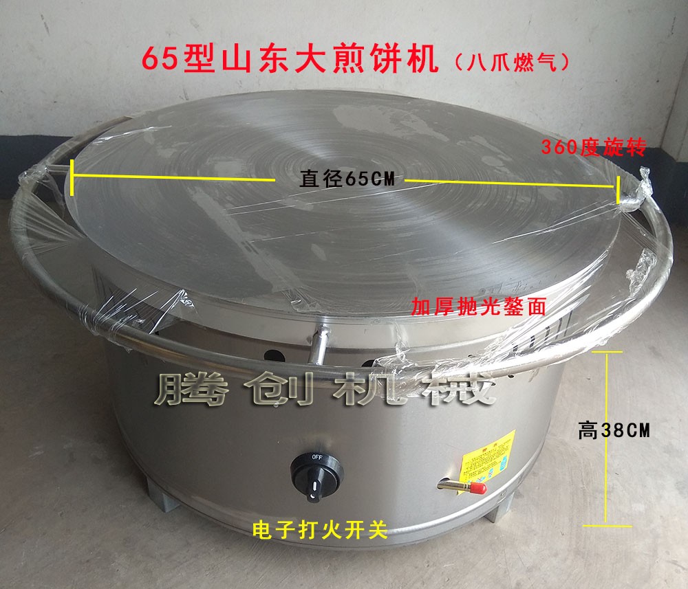 新款大型燃气煎饼机,采用液化气为能源的煎饼鏊子,操作简单方便,节能、干净卫生。方便户外摊制经营。做正宗的山东大煎饼就得用燃气煎饼炉,尺寸足够大可以做多种口味的五谷杂粮煎饼!锅面直径65cm