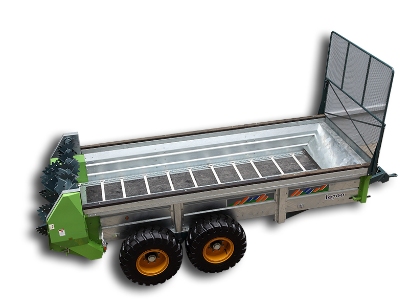 厩肥撒播机是一种装载量大,能把肥料撒播还田的新型农机具。利用拖拉机后动力输出,带动车厢内的输送链自动把肥料向后输送,然后通过高速旋转的破碎轮和撒播轮均匀的将肥料撒布还田。