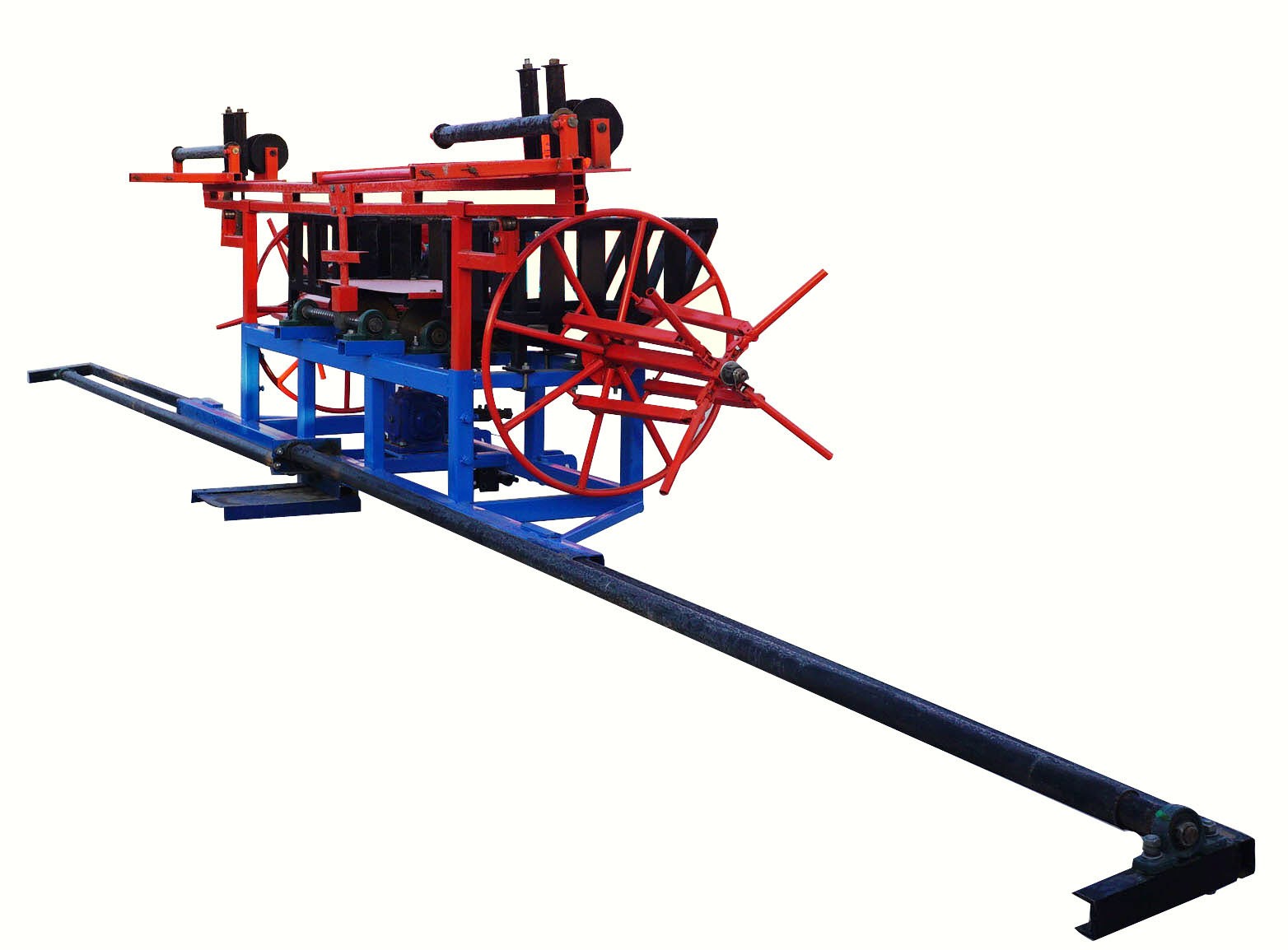 利用一根卷盘轴带动数个卷盘,再利用卷盘轴上的一段双向丝杆机构带动双向滑杆左右滑动,将滴灌带均匀地缠绕在卷盘内