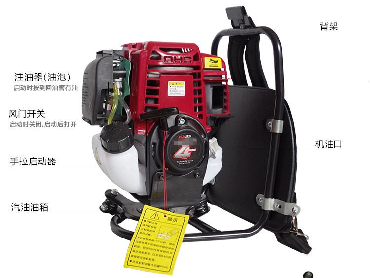 本田GX35割草机/割灌机,四冲程发动机,功率大省油,可以开荒、割各种杂草、松土、锄草、除草。割小麦、割水稻等多种用途,是一种多功能的小型家用割草机。