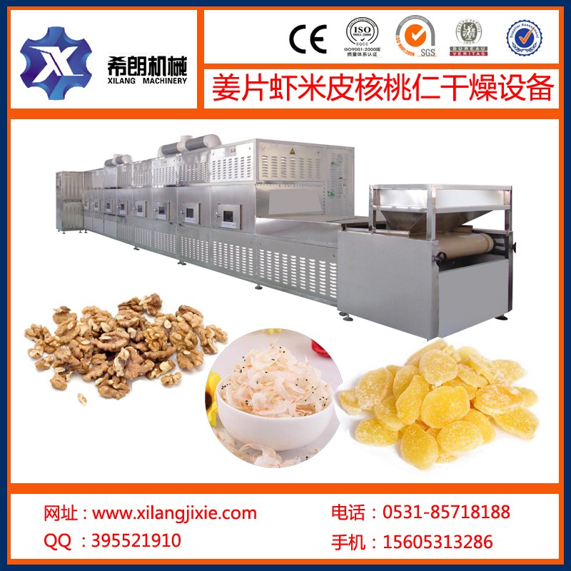 姜片微波烘干杀菌机特点:物料在微波电磁场的直接作用下,均匀加热,无需经过热传导。卫生、高效,膨化效果好于常规工艺。同时在微波的热效应和非热效应的双重作用下具有杀菌功效。