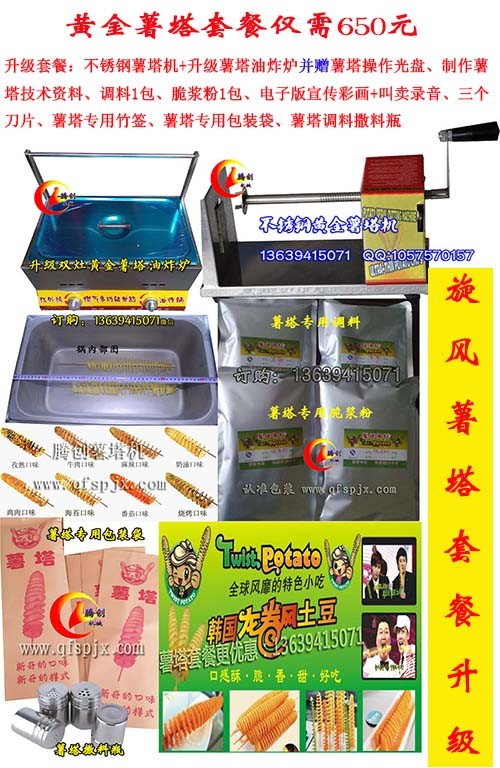 不锈钢薯塔机+燃气炸薯塔油炸炉赠豪华大礼包:薯塔操作光盘、制作薯塔技术资料、电子版宣传彩画+叫卖录音、三个刀片、薯塔专用竹签、薯塔专用包装袋、薯塔调料撒料瓶、调料1包、脆浆粉