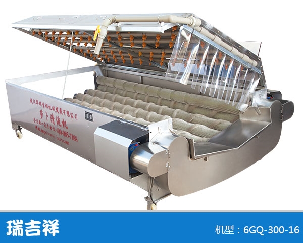 萝卜清洗机6GQ-300-16型外形美观、操作方便,清洗量大、耗能小,效率高,可连续清洗,使用寿命长等特点,刷辊材料经特殊工艺处理,经久耐用,耐磨性能好;渗碳级链轮,特种合金钢双链条传动,五年无需更换