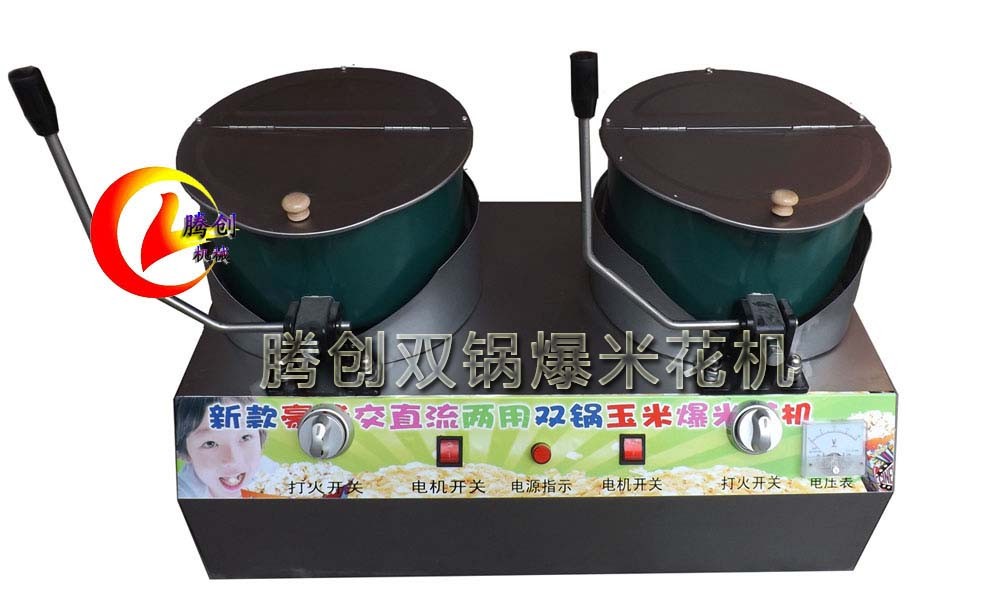 新款不粘锅交直流两用双锅玉米爆花机,在原来的基础上质量升级,设计改良,使用更加方便。仍是以液化气为热源,交流220v或者12v电瓶为搅拌动力,一人就可以操作方便流动