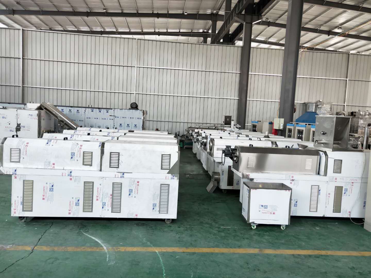 该机由供料系统、挤压系统、旋切系统、加热系统、传动系统、控制系统组成。采用先进的螺杆挤压膨化技术,利用高温高压将物料熟化并膨化成型,一次性完成。主机采用变频调速,保证生产过程的稳定性。产品花色、品种多