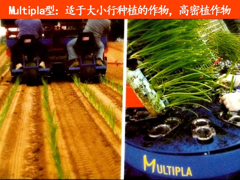 适于大小行种植的作物,高密植作物;转轮式人工投苗,金属苗杯;最高移栽速度:5000株/行/小时;行距:30-100;最小株距:8厘米,连续可调;最大作业行数:8;拖拉机功率范围(马力):15-130