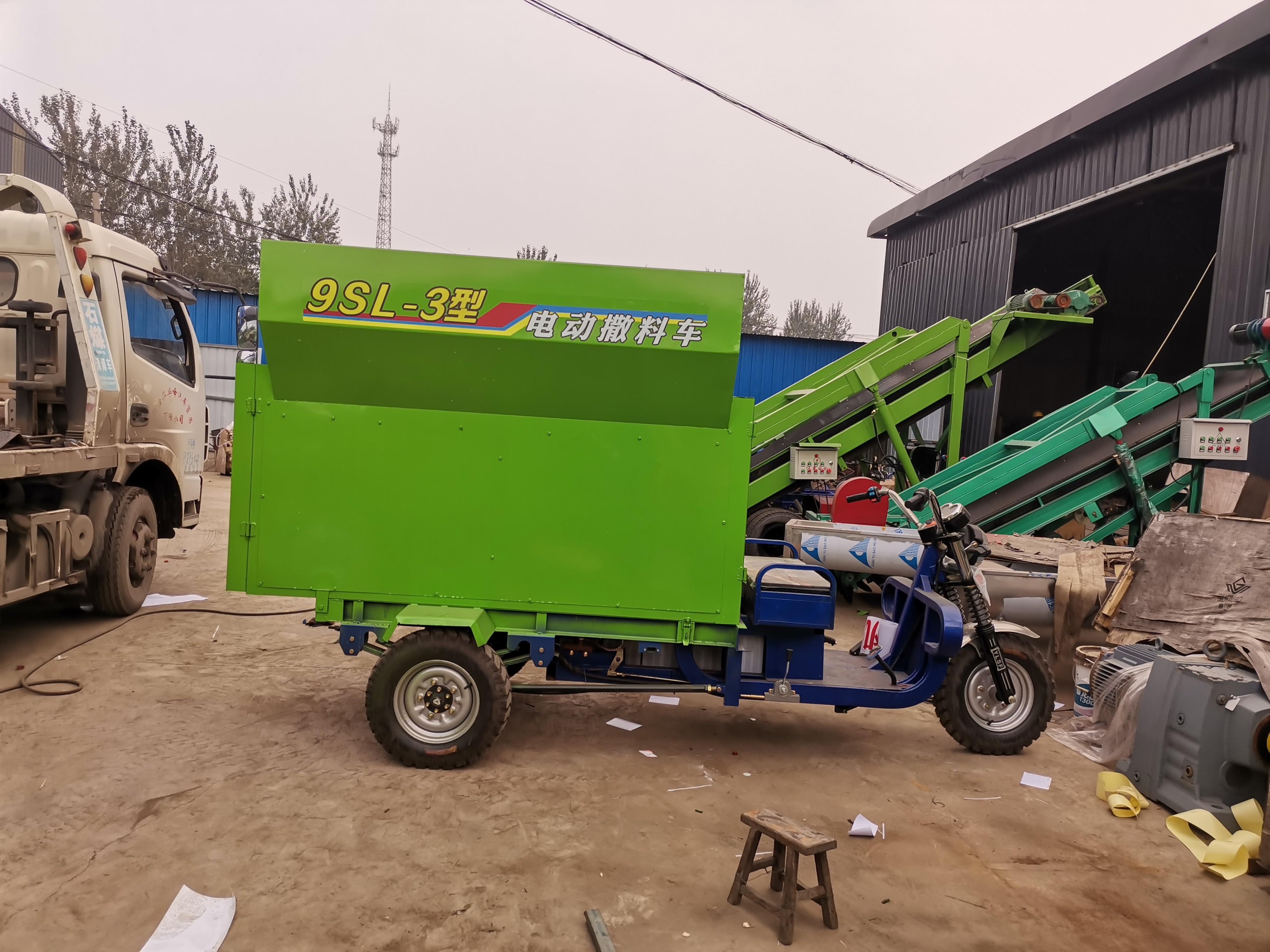 适用于中小规模的育肥猪舍牛羊舍,把饲料装入喂料车,利用电瓶动力通过皮带输送把饲料喂入牲畜食槽,喂料方便,节省人力物力,撒料过程及速度可以控制,操作简单实用;绿色环保: