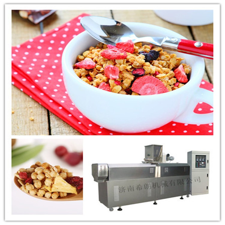 谷物脆生产采用济南希朗双螺杆挤压膨化机 食品挤压加工概括地说是将食品物料置于挤压机的高温高压状态下,然后突然释放至常温常压,使物料内部结构和性质发生变化的过程