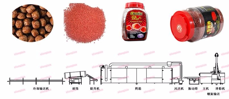 整套鱼饲料生产线,包括:原材料分类筛选清理,粉碎,混合,成型膨化,烘干,调味,包装。 玉米粉经过膨化具有可以消毒、灭菌、增加粗蛋白、提高总能量、使淀粉的糊化度大大提高的作用
