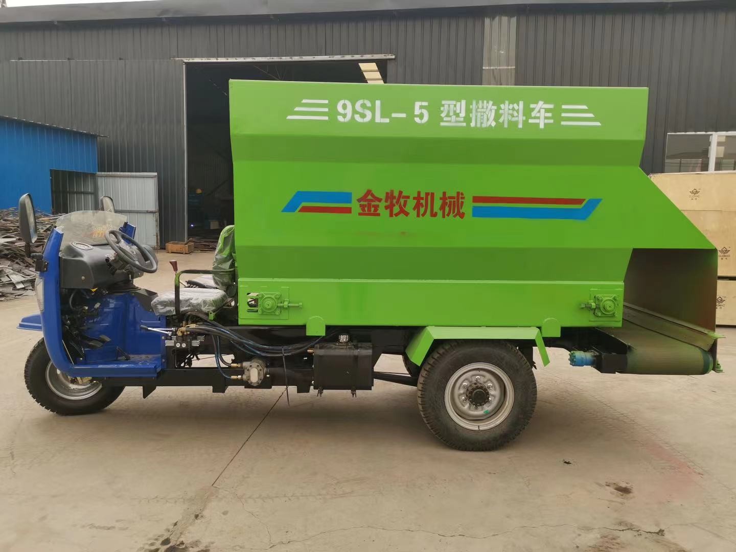 1.该机器采用电动三轮车运送, 2.降低劳动强度,减少饲喂成本。 3.可双侧撒料,饲喂快捷高效。 4.物料抛撒迅速,档位调节撒料速度。