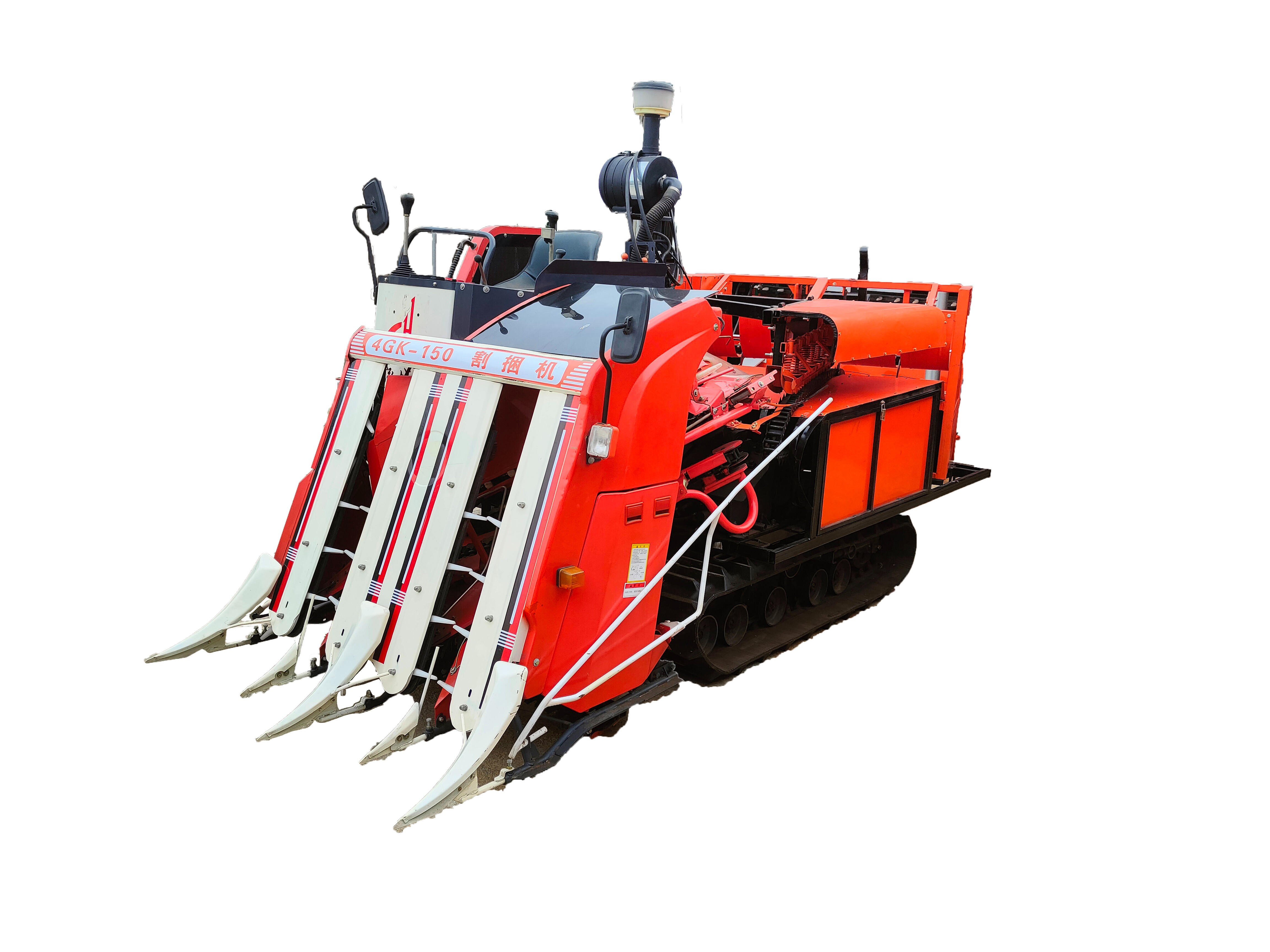 4GK-150割捆机作物秸秆被收割台收割之后,经过输送器向后输送,落入卸料台,在经过捆扎机构打结成捆后自动卸下。