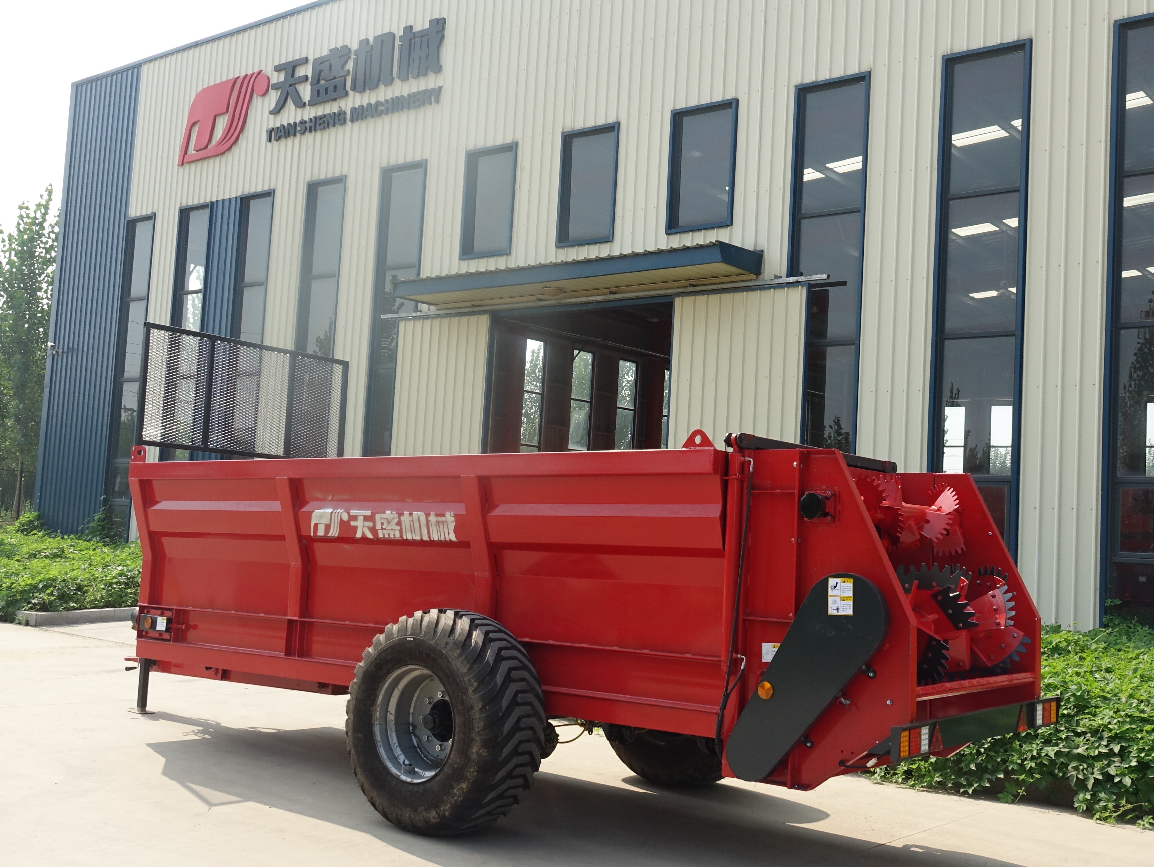 1,该型号撒肥车设计为采用拖拉机牵引,拖拉机后输出轴驱动抛撒动作,拖拉机输出液压驱动送料系统工作; 2,整机采用半轴双轮胎行走模式,共有四个轮胎,接地比压较小; 3,主体车架采用合金钢
