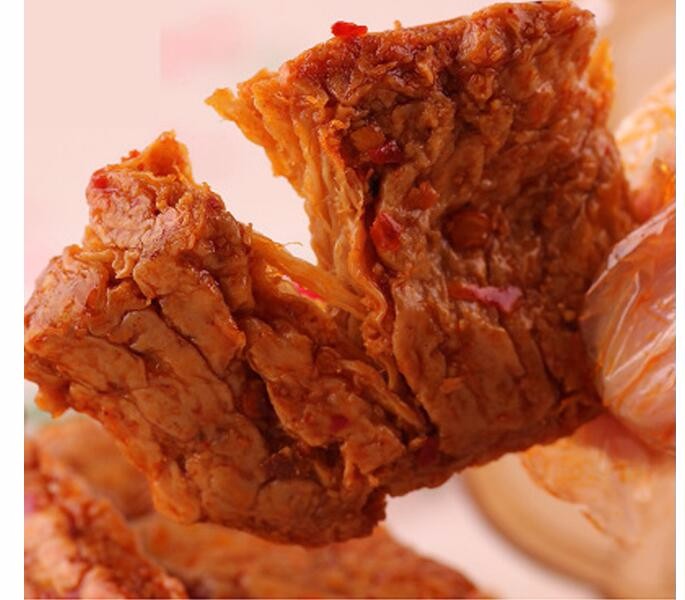 以低温豆粕、花生粕为主要原料,经粉磨、搅拌、调质、高温、高压、高剪切,将球形蛋白质分子打开成链状并重新组织化,形成如肉状纤维结构的如瘦肉状且有咀嚼感的新型食品;其产品营养价值高,具有肉的状态和口感