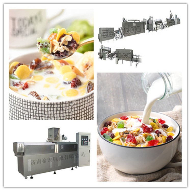 早餐谷物膨化麦片主要以常见的谷物杂粮粉为主要原料,经双螺杆挤压膨化工艺制成颗粒形状后,再经烘干、喷涂调味、混合添加坚果水果干货酸奶块制成的多样化丰富早餐食品