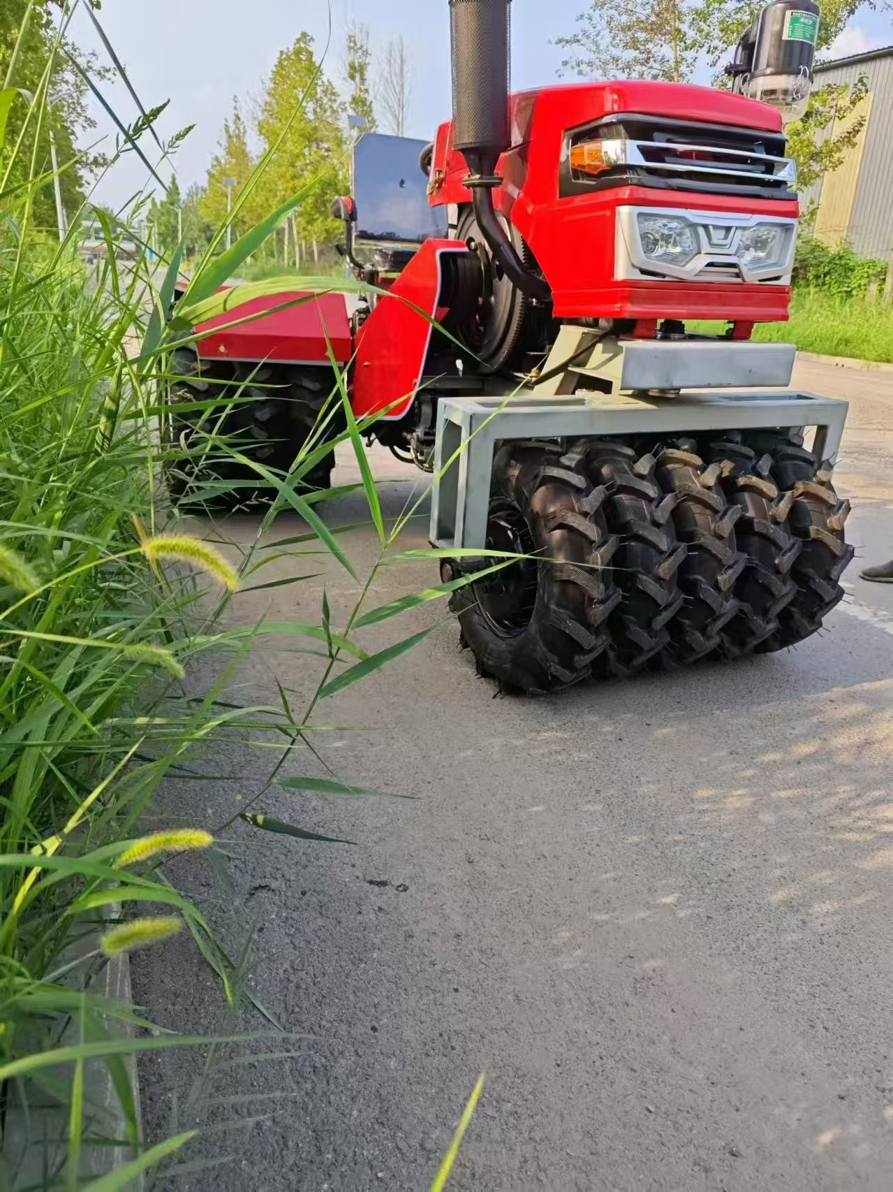 发动机动力220马力;加装了立式旋转剃草滚解决了防止杂草缠绕问题--即冠军薄式塔轮2.2米割台;浮动式喂入辊;滚筒式旋转切碎器;揉搓式抛送器,自带料箱等。