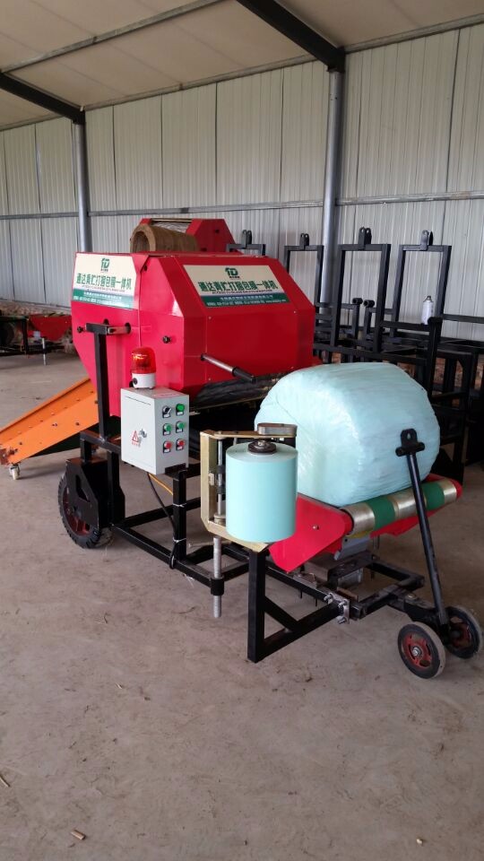 通达秸秆青贮饲料打捆包膜机价格 秸秆青贮工艺为将秸秆揉碎、对揉碎的秸秆进行打捆、经PE牧草膜包裹后进行贮存发酵,以上工序分别由揉搓机、青储打捆包膜机完成,通达牌青贮打捆包膜一体机的研制成