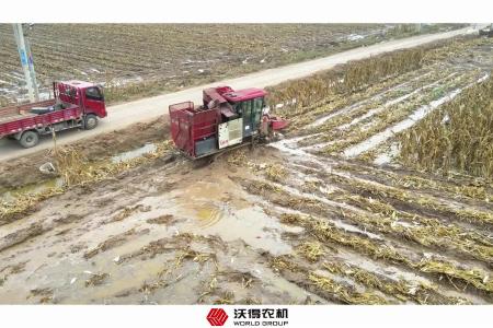 沃得裕龙玉米收割机山东省潍坊市泥地作业现场